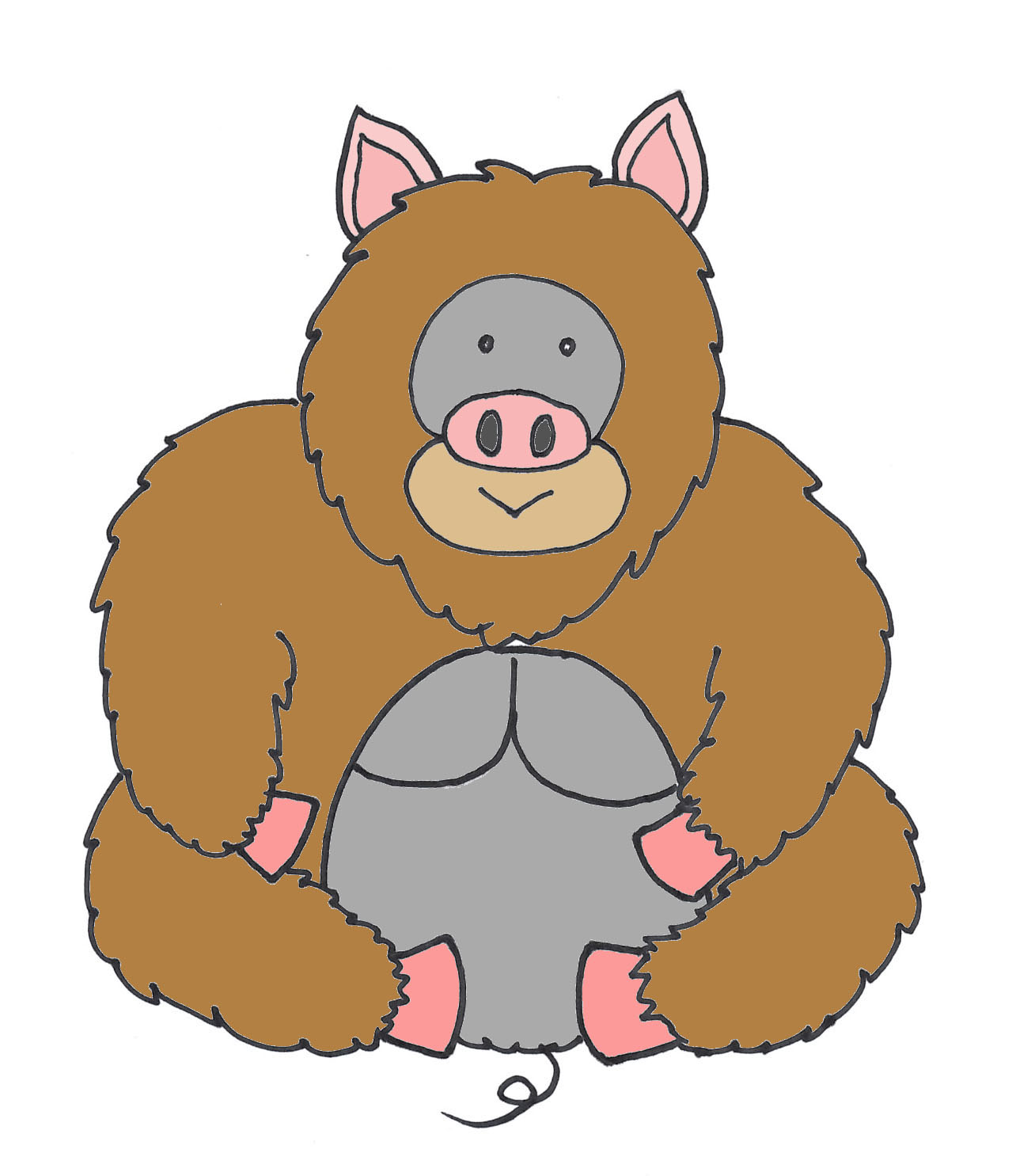 僕の名前はオランブータン!ママがブタでパパがオランウータンなんだよ!ママは若い時トラックに積まれて肉の加工場へ運ばれる途中逃げ出したんだ!どんどん森の奥へ逃げ込んでいって道に迷っておなかがすいて動けなくなったときにパパに助けられたんだ!暫く一緒にいるうちに二人は仲良くなって結婚し、僕が生まれたっていうわけさ!